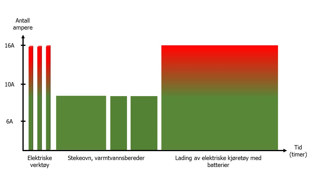 A household socket has been developed and dimensioned for easy connection of small loads such as lamps, kitchen equipment, electrical tools and the like. These are current chargers that normally draw upwards of 6-10 amps. It can withstand higher loads such as powerful hand tools for short periods. Daily charging of electric vehicles represents a continuous load over a long period of time (depending on battery size) that is at the limit of what a household socket can withstand. If the current is so great over time that it generates heat, this heat generation can in turn weaken the socket's springs so that the contact weakens and makes contact between conductors worse. This, in combination with high amperage, results in further heating with the risk of fire in the socket as the ultimate consequence. Below we have illustrated the various loads a normal socket will normally be exposed to.